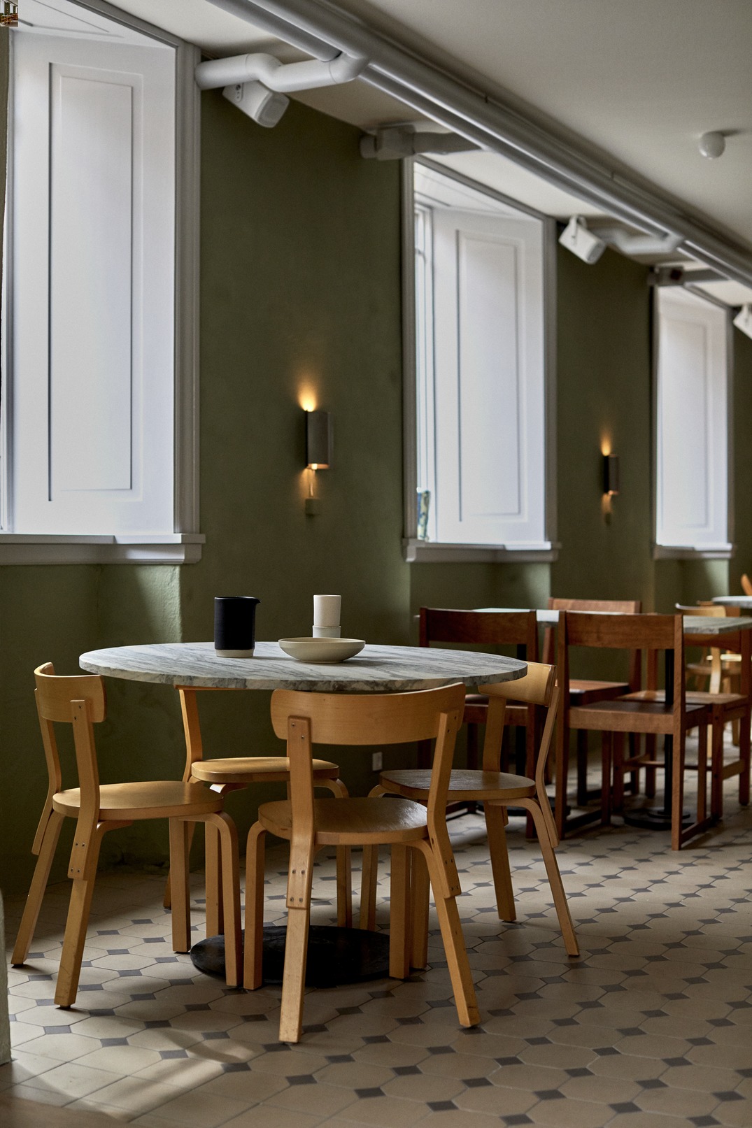A mix of seating was designed and sourced for this project - the chairs above are stained a warm brown for a vintage feel. The Chair 01 produced by Frama was added to the Permenent collection as a best selling finish.
